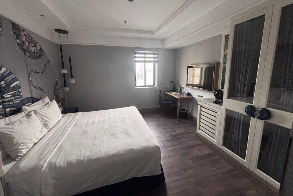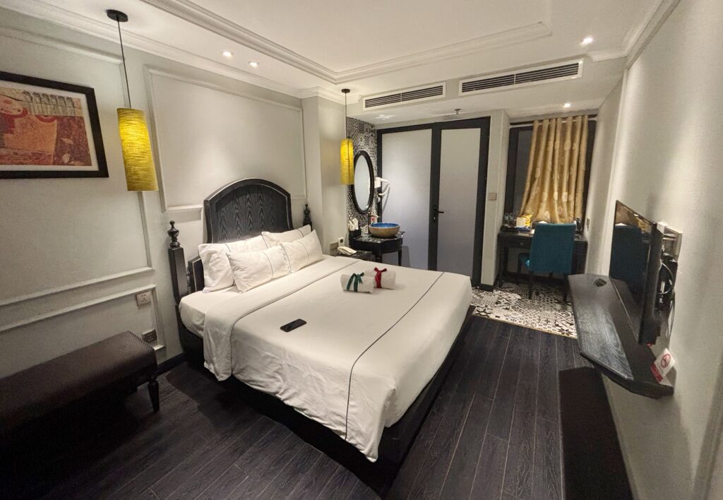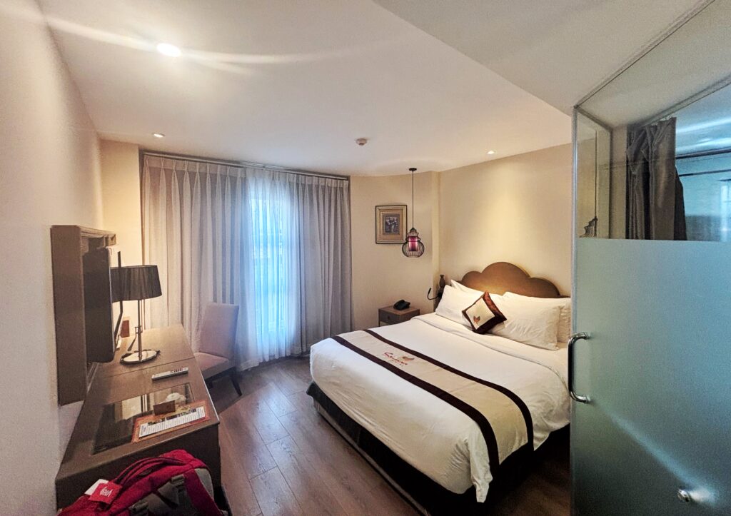 Coming to the room — the size was adequate for two people, though it was the smallest room we stayed in during our Vietnam trip. That said, there were no complaints regarding cleanliness or facilities. Despite being on a busy street, the room was surprisingly quiet, ensuring a good night’s sleep.